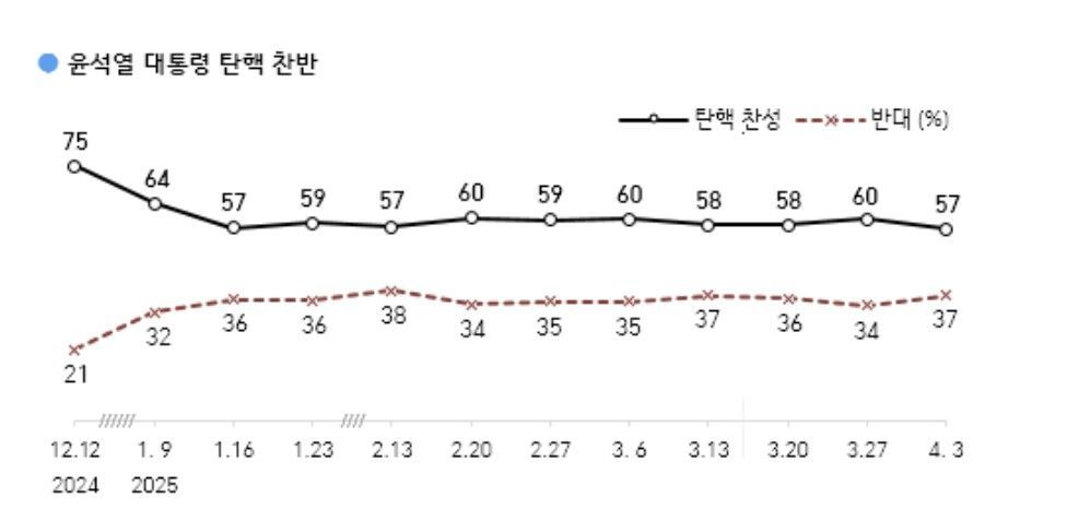 윤석열 대통령이 탄핵되어야 한다는 응답자가 전체 응답자의 57%에 이른다는 여론조사가 나왔다.