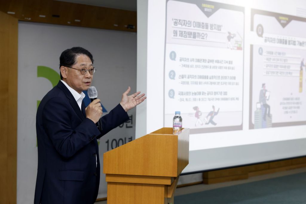 황상하 서울주택도시공사(SH공사) 사장이 '공직자의 이해충돌방지법'을 주제로 강연하고 있다. SH공사