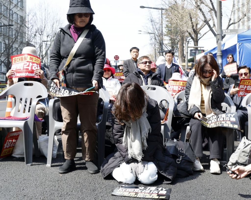 헌법재판소가 윤석열 대통령 탄핵안 인용을 선고한 3일 서울 종로구 헌법재판소 인근에서 윤 대통령 지지자들이 슬퍼하고 있다.