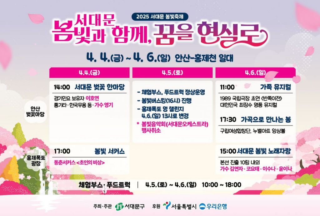 서울 서대문구(구청장 이성헌)가 이달 4∼6일 안산(鞍山)과 홍제천 일대에서 개최할 예정이던 ‘서대문 봄빛과 함께, 꿈을 현실로 - 2025 서대문 봄빛축제’ 행사 일정을 축소 변경했다고 4일 밝혔다.