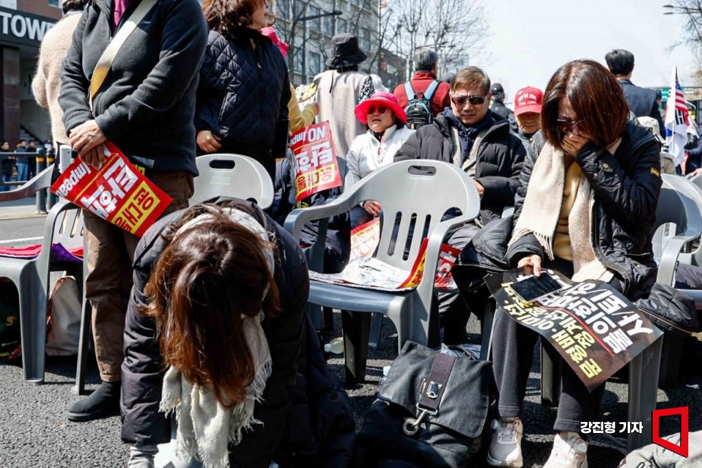 헌법재판소가 윤석열 대통령 탄핵안 인용을 선고한 3일 서울 종로구 헌법재판소 인근에서 윤 대통령 지지자들이 슬퍼하고 있다.