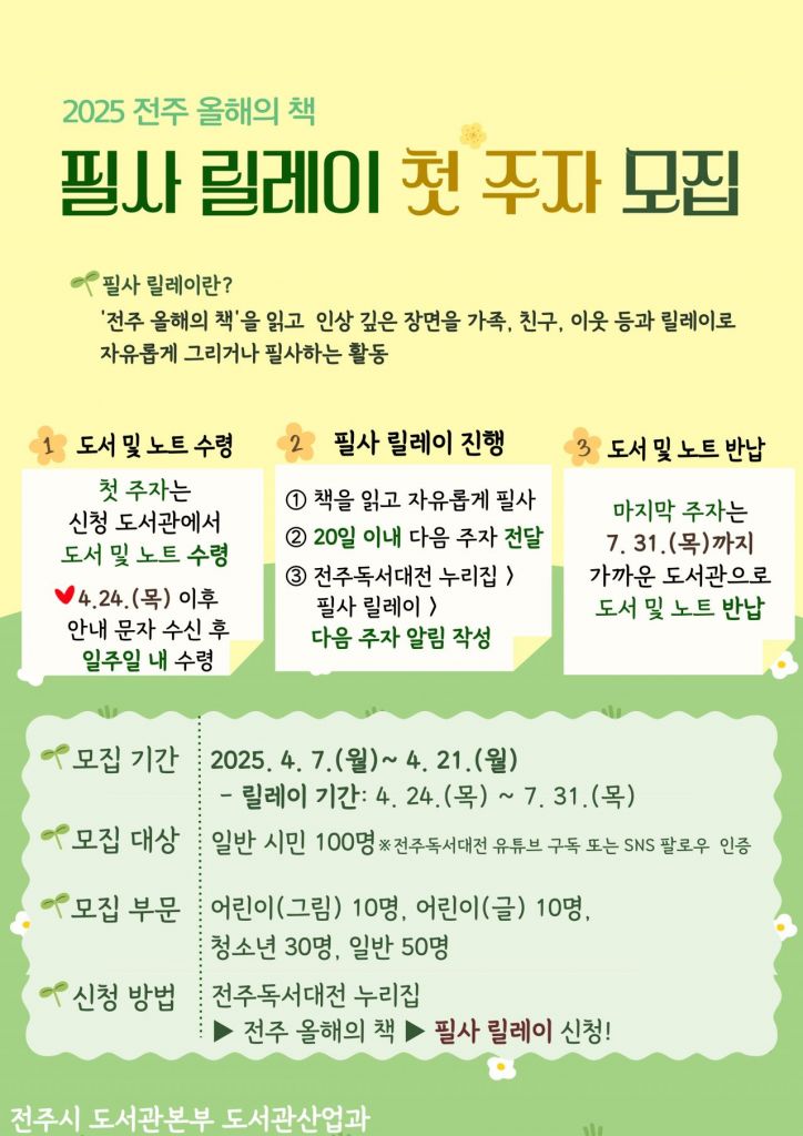 첫 주자는 신청 부문 도서와 노트를 가까운 시립도서관에서 수령하고, 책을 읽고 필사한 뒤 전주독서대전 누리집 내 ‘필사 릴레이 코너’에 한 줄 평과 다음 주자 알림을 남기면 된다.