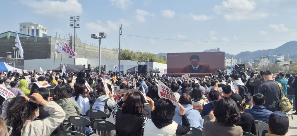 헌법재판소의 윤석열 대통령 탄핵심판 선고를 앞둔 4일 오전, 광주 동구 5·18 민주광장에는 ‘윤석열 즉각퇴진·사회대개혁 광주비상행동’의 집회에 참여한 시민 1,000명(주최 측 추산)이 모여 대형 스크린으로 중계되는 헌재 선고를 지켜보고 있다. 김완중 기자