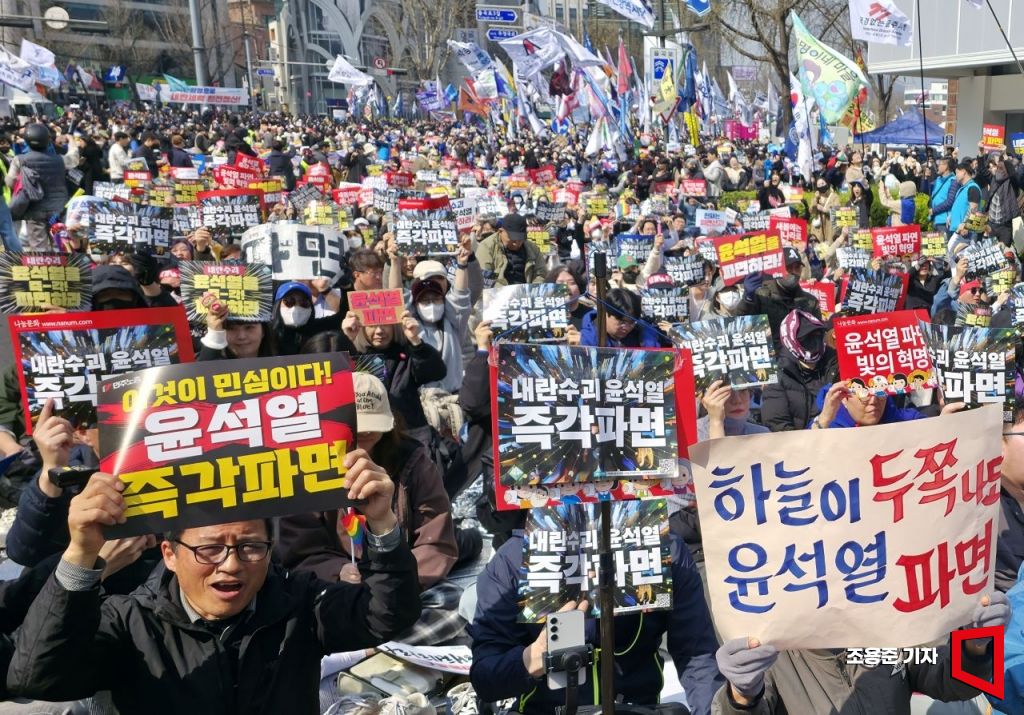 윤석열 대통령 탄핵 선고일인 4일 오전 헌법재판소 부근 서울 안국동에서 탄핵을 찬성하는 시민과 단체 회원들이 찬성 촉구 집회에서 구호를 외치고 있다.