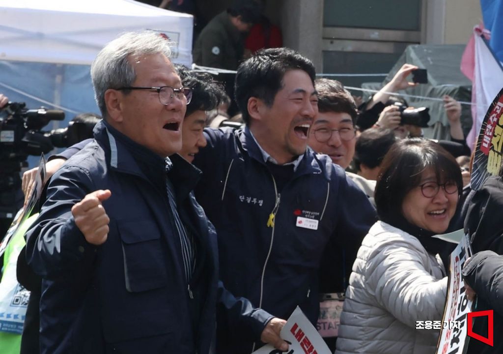 헌법재판소가 윤석열 전 대통령 탄핵 사건에 대해 인용을 선고한 4일 서울 종로구 안국동 일대에서 탄핵에 찬성한 시민들이 헌재의 파면 선고에 환호하고 있다.