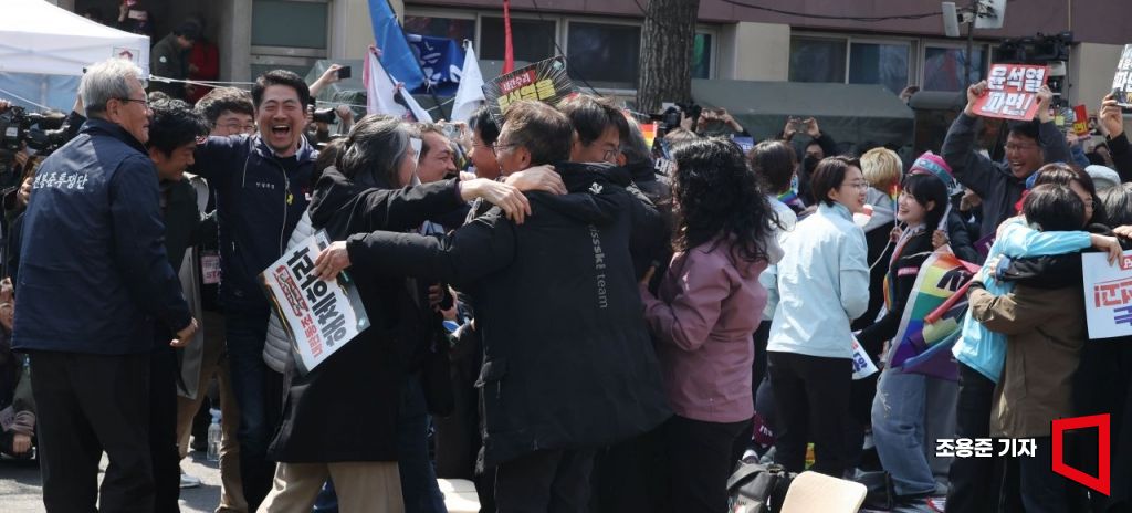 헌법재판소가 윤석열 전 대통령 탄핵 사건에 대해 인용을 선고한 4일 서울 종로구 안국동 일대에서 탄핵에 찬성한 시민들이 헌재의 파면 선고에 환호하고 있다.