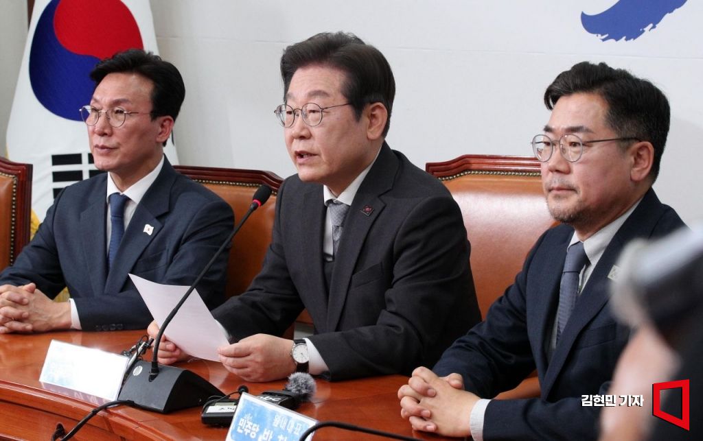이재명 더불어민주당 대표가 4일 국회에서 헌법재판소의 윤석열 대통령 파면 선고 관련 입장을 밝히고 있다.