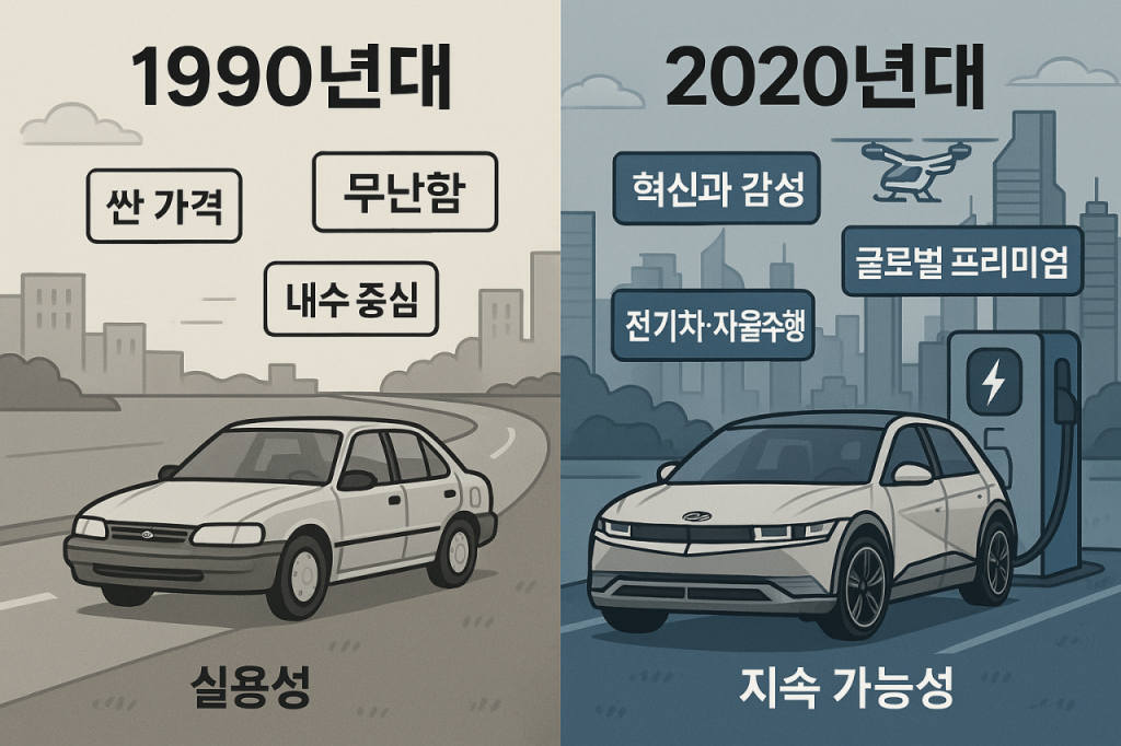 생성형 인공지능(AI) 챗GPT에 1990년대와 2020년대의 현대차·기아 브랜드에 대한 인상을 그림으로 그려달라고 요청했다. 1990년대 현대차를 나타낸 이미지에는 동글동글한 디자인의 세단 엑셀과 함께 ▲싼 가격 ▲무난함 ▲내수 중심 ▲실용성이란 키워드가 등장했다. 2020년대에는 직선형 디자인이 강조된 전기 스포츠유틸리티차량(SUV) 아이오닉 5가 중앙에 배치됐고 ▲혁신과 감성 ▲글로벌 프리미엄 ▲전기차·자율주행 ▲지속가능성 등의 키워드가 그려졌다. 배경에는 차세대 모빌리티 수단인 미래항공교통(AAM)도 추가됐다.