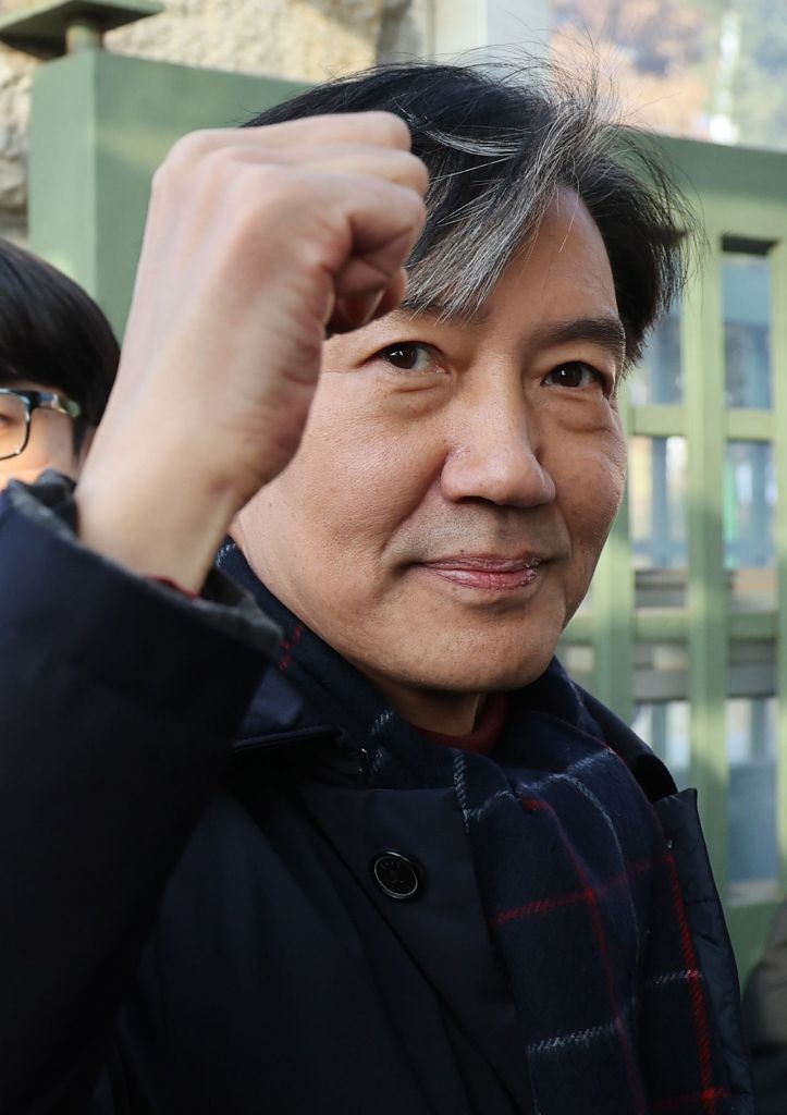 조국 전 조국혁신당 대표가 16일 오전 경기도 의왕 서울구치소 앞에서 수감되기 전 지지자들을 향해 주먹을 쥐어보이고 있다. 연합뉴스