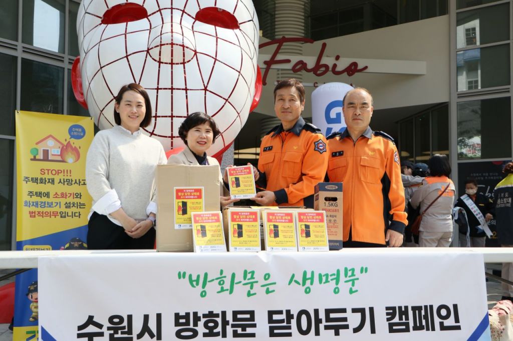수원남부소방서가 4일 수원 인계동에서 '방화문닫아두기 캠페인'을 펼쳤다. 수원남부소방서 제공