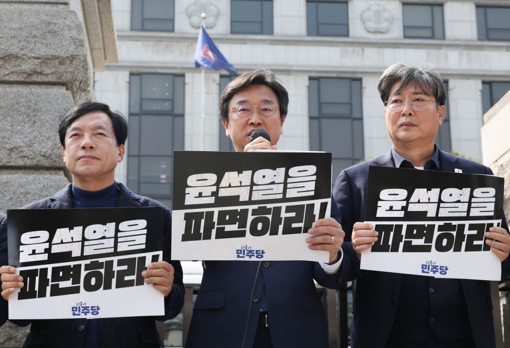이용우 더불어민주당 의원이 지난달 24일 서울 종로구 헌법재판소 정문 앞에서 열린 헌재의 윤 대통령 탄핵 심판 선고 기일 지정을 촉구하는 기자회견에서 회견문을 낭독하고 있다. 연합뉴스