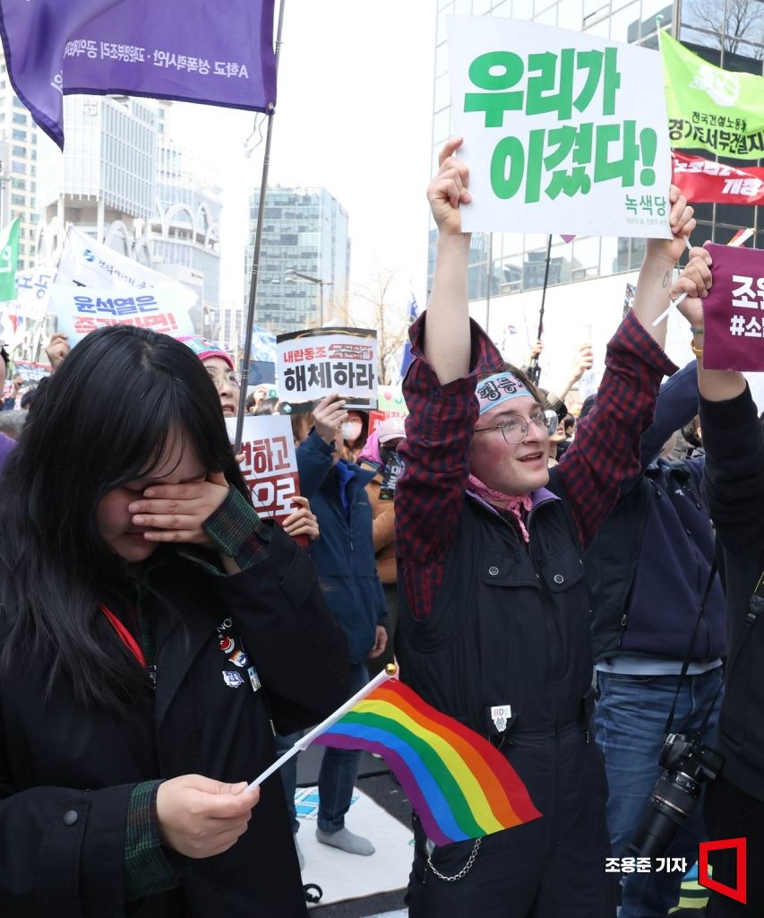 헌법재판소가 윤석열 전 대통령 탄핵 사건에 대해 인용을 선고한 4일 서울 종로구 안국동 일대에서 탄핵에 찬성한 시민들이 헌재의 파면 선고에 환호하고 있다. 2025.4.4 조용준 기자