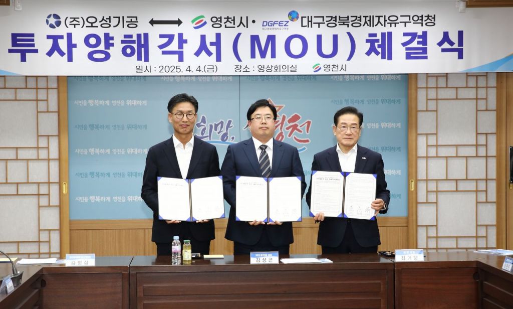 대구경북경제자유구역청(청장 김병삼)과 영천시는 4일 시청에서 ㈜오성기공과 투자양해각서(MOU)를 체결했다.