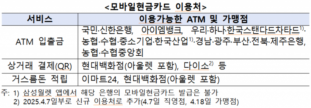 이번 연계로 금융소비자는 모바일현금카드 공동 앱 외에도 삼성월렛 앱을 통해 서비스를 이용할 수 있게 됐다. 활용 가능한 서비스는 17개 금융기관의 ATM 입출금, 상거래 결제, 거스름돈 적립 등이다.