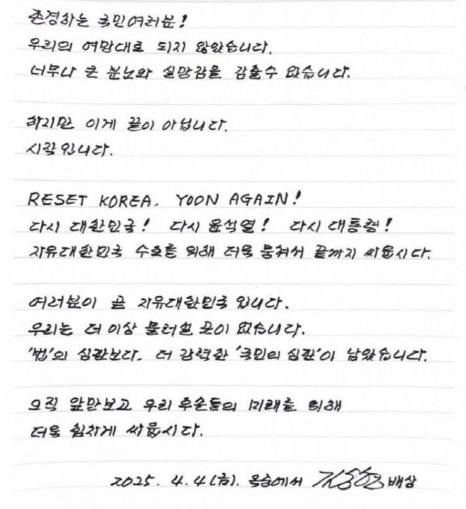 헌법재판소가 윤석열 전 대통령을 파면한 가운데 김용현 전 국방부 장관이 옥중 메시지를 냈다.
