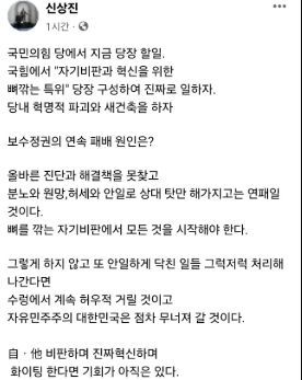 그는 “국민의힘은 ‘자기비판과 혁신을 위한 뼈깎는 특위’를 즉시 구성하고, 보여주기식이 아닌 실질적인 혁신에 나서야 한다”며 “보수 정권의 연이은 패배 원인을 냉정히 분석해보면, 문제의 핵심은 외부가 아니라 내부에 있다”고 밝혔다.
