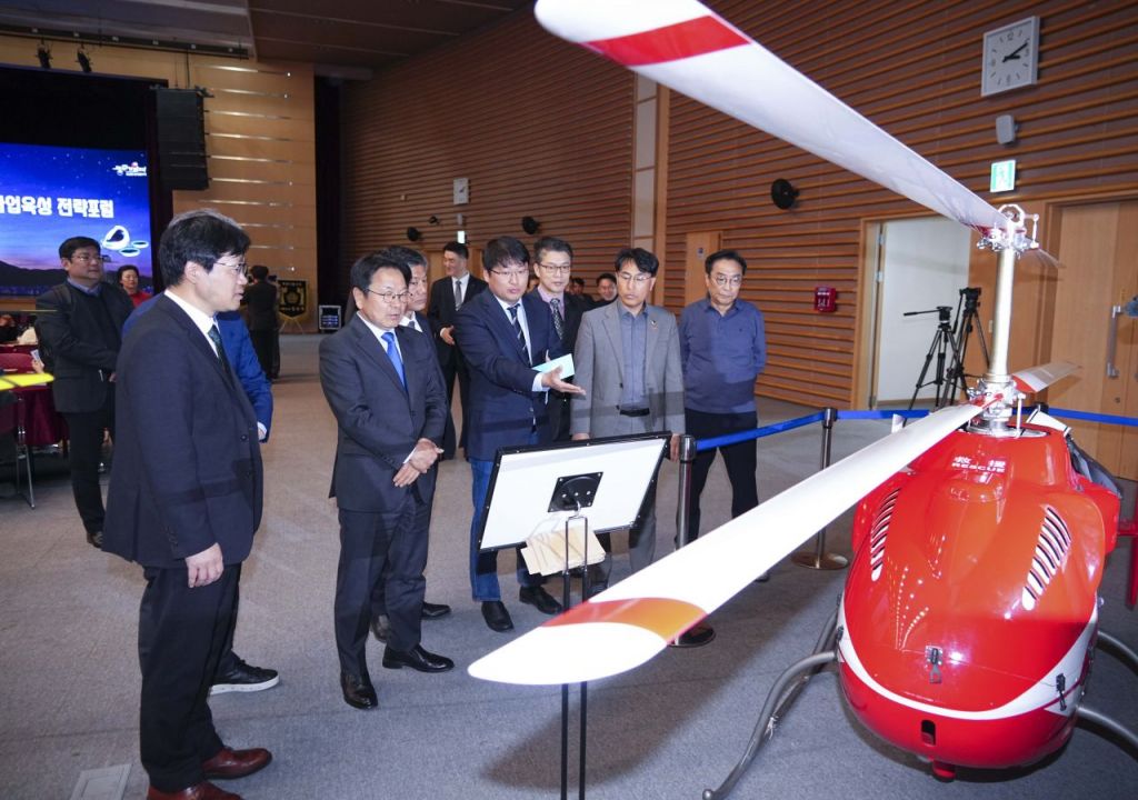 강기정 광주시장이 지난 4일 오후 서구 김대중컨벤션센터에서 열린 ‘2025 미래항공모빌리티(AAM) 산업육성 전략 포럼’에 참석, 내빈들과 기업제품을 살펴보고 있다. 광주시 제공