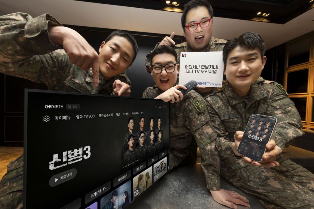 KT의 오리지널 콘텐츠인 '신병 3' 출연 배우들이 '지니TV'의 슬로건 '어디서나 만날지니'를 소개하고 있다. KT