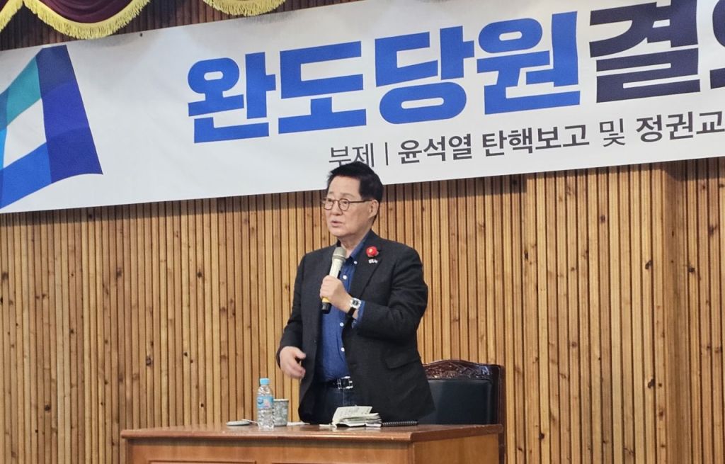 더불어민주당 박지원 의원이 지난 5일 전남 해남·완도 지역사무실에서 당원 결의대회를 열고 “윤석열 전 대통령의 파면은 끝이 아닌 시작”이라며 정권교체를 향한 강한 실천 의지를 밝혔다.
