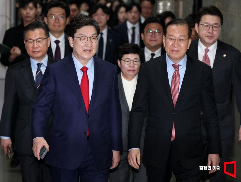권영세 국민의힘 비상대책위원장과 권성동 원내대표가 윤석열 대통령 탄핵심판 선고일인 4일 국회에서 열린 비상대책위원회의에 참석하고 있다. 2025.4.4 김현민 기자