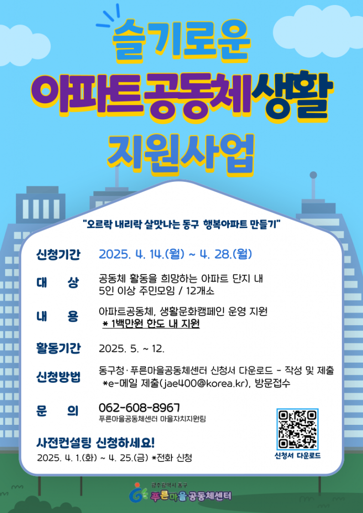 아파트 입주민 5인 이상이 모인 공동체라면 신청이 가능하며, 접수 기간은 14~28일이다. 이메일 및 현장 접수를 받으며, 자세한 내용은 동구청 및 푸른마을공동체센터 누리집을 통해 확인하면 된다. 궁금한 점은 푸른마을공동체센터 마을자치지원팀으로 문의하면 된다.