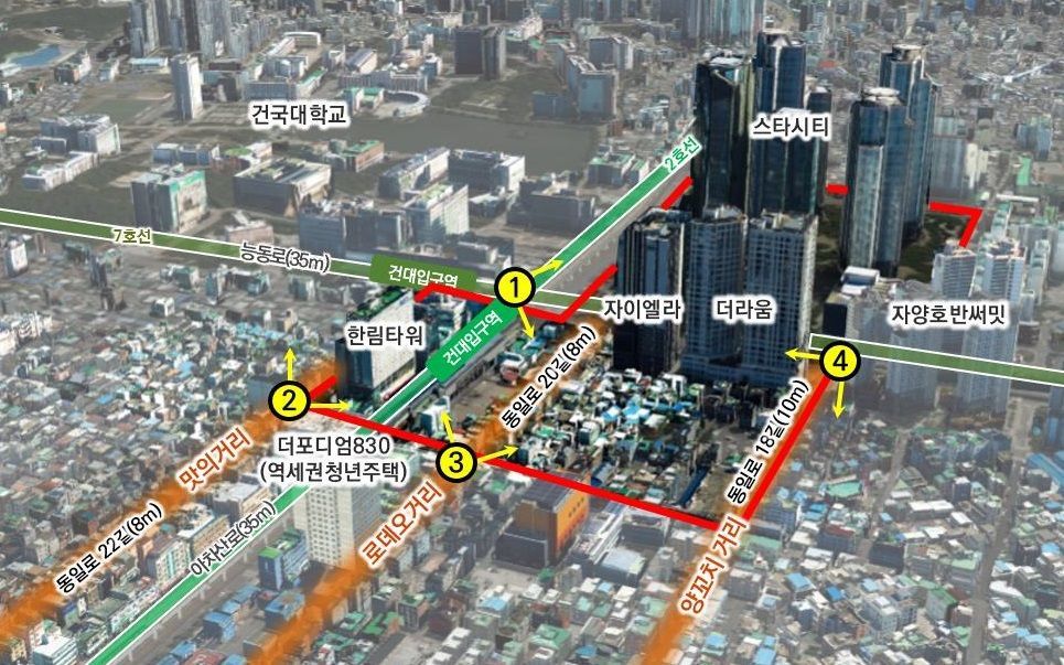 특히, 건국대·세종대 등 대학 자원과 함께 맛의 거리, 로데오거리, 양꼬치 골목 등 특화 거리 조성으로, 일평균 이용 인구 13만 명의 서울 동북권 대표 소비 중심지로 자리매김했다.