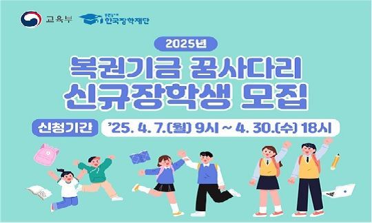 교육부(부총리 겸 교육부장관 이주호)와 한국장학재단(이사장 배병일)은 2025학년도 복권기금 꿈사다리 장학생을 선발한다고 7일 밝혔다.