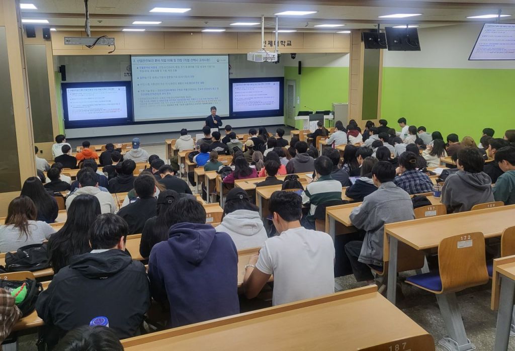 권구형 양산지청장이 인제대 재학생들을 대상으로 안전보건분야 청년 취업특강을 진행하고 있다.