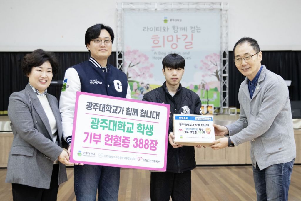 광주대학교와 ㈔한국백혈병소아암협회 광주전남지회가 최근 개최한 사회공헌 활동인 '라이티와 함께 걷는 희망길' 행사에서 광주대 학생과 교직원이 지난해 모은 헌혈증 388매를 한국백혈병소아암협회에 전달했다. 광주대학교 제공