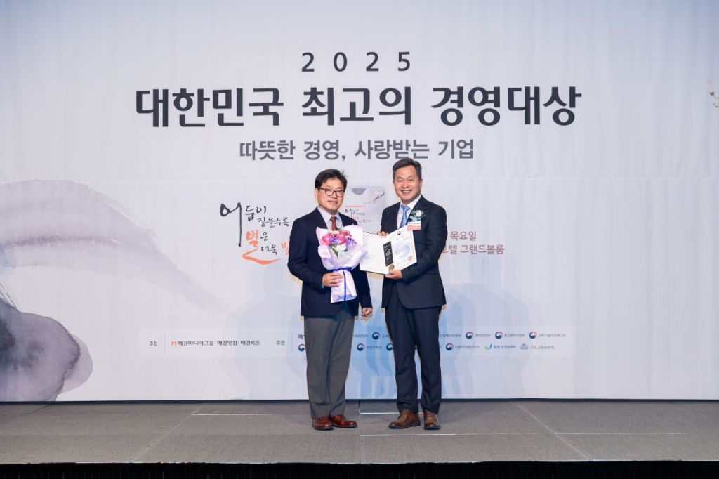 주식회사 마창대교 김성환 대표이사(오른쪽)가 ‘2025 대한민국 최고 경영대상’ 시상에서 받은 사회공로 우수 기관 보건복지부장관상을 들어보이고 있다. 주식회사 마창대교 제공