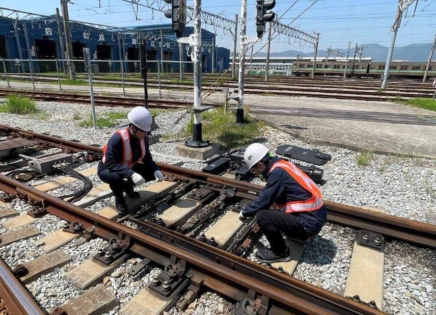 부산교통공사 관계자들이 선로전환기를 점검하고 있다.