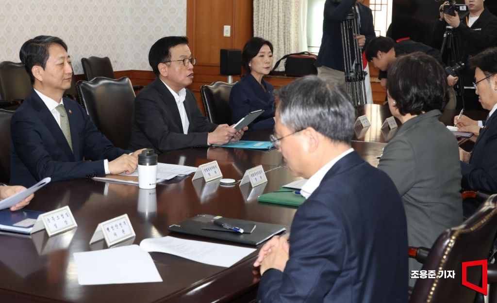 최상목 부총리 겸 기획재정부 장관이 8일 서울 종로구 정부서울청사에서 미국 관세 부과에 따른 분야별 영향 점검을 논의하기 위해 열린 경제관계장관 현안 간담회에 참석, 발언하고 있다.