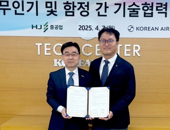 HJ중공업 고광재 상무(왼쪽)와 대한항공 항공기술연구원 김경남 원장이 업무협약을 맺고 있다.