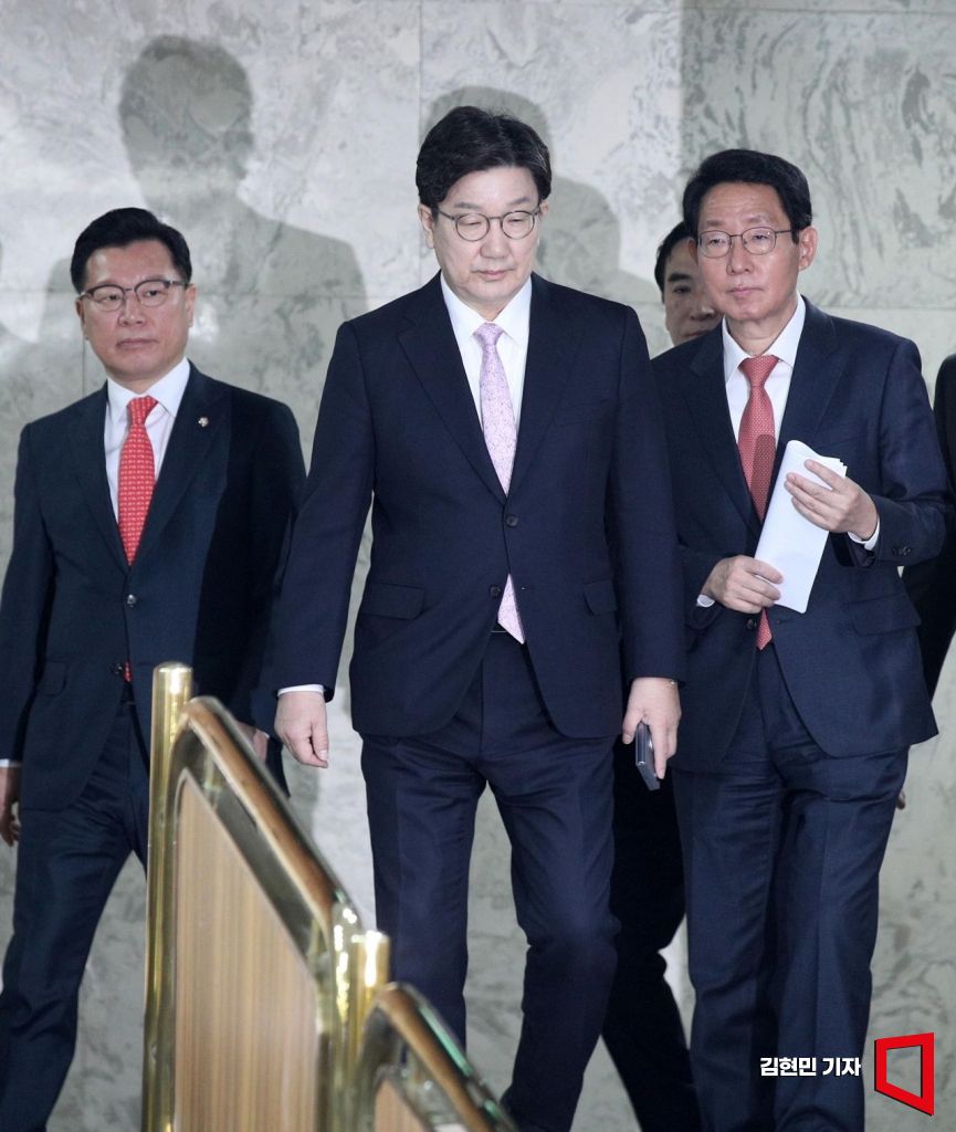 권성동 국민의힘 원내대표가 8일 국회에서 열린 원내대책회의에 참석하고 있다.