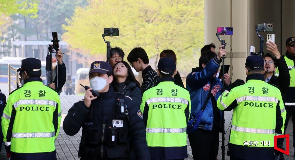 유튜버들이 8일 서울 서초구 중앙지검에서 이재명 더불어민주당 대표의 공판 출석 장면을 촬영하고 있다. 2025. 04. 08 윤동주 기자