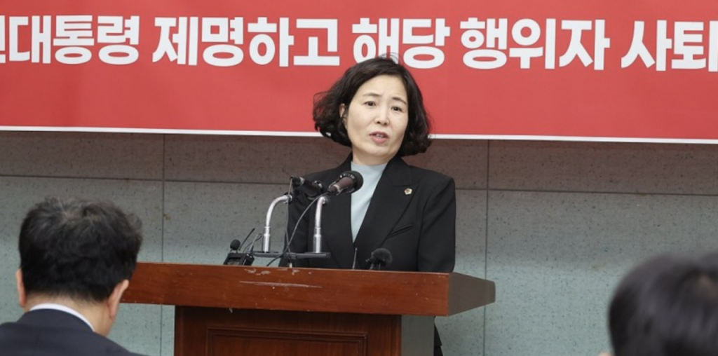 이수진 전북특별자치도의회 의원(국민의힘·비례)이 8일 도의회에서 자당의 행태를 지적하는 기자회견을 하고 있다. 연합뉴스