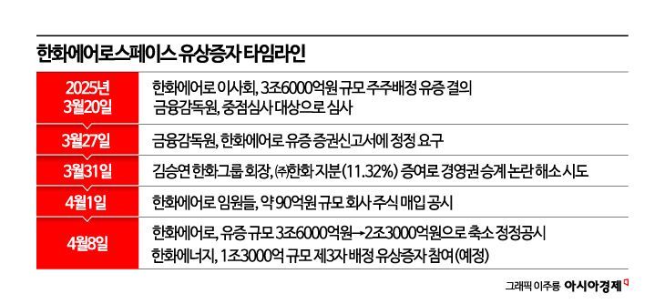이에 앞서 한화에어로스페이스는 이전에 3조6000억원으로 정했던 주주배정 유상증자 규모를 2조3000억원으로 축소한다고 밝혔다. 나머지 1조3000억원 규모 자금은 ‘오너 일가’가 지분 100%를 보유한 한화에너지가 참여하는 제3자 유상증자를 통해 확보한다. 이 방식이 확정되면 한화에너지는 한화에어로스페이스의 1조3000억원 규모 제3자 배정 유상증자에 할인 없이 참여하게 된다. 한화에어로스페이스가 한화오션 매각대금으로 한화에너지에 지급한 1조3000억원이 결과적으로 한화에어로스페이스에 되돌아가는 셈이다. 반면 한화에어로스페이스의 주주배정 유상증자에 참여하는 소액주주들은 15% 할인 가격으로 주식을 살 수 있다.