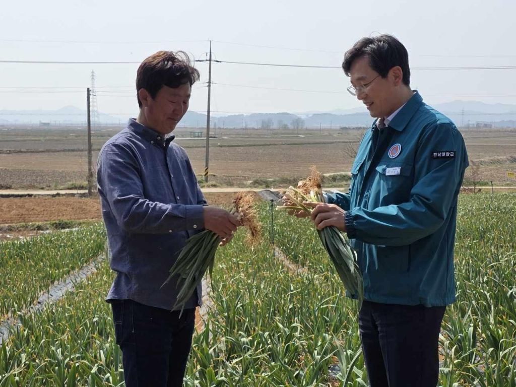 우승희 영암군수가 지난 7일 '2025년산 마늘 계약재배 시범사업'이 진행되고 있는 시종면의 농가들을 찾아 포장별 생육 상황을 점검하고, 농민 의견을 청취했다.