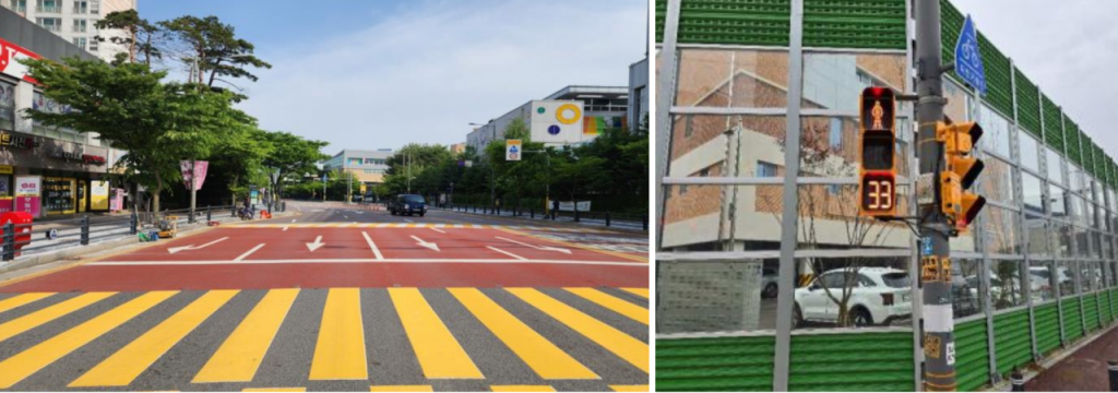 용인시가 서농초등학교 앞 어린이보호구역에 조성한 노란색 횡단보도(왼쪽)과 고진초에 설치한 보행대기 잔여시간 표시장치. 용인시 제공