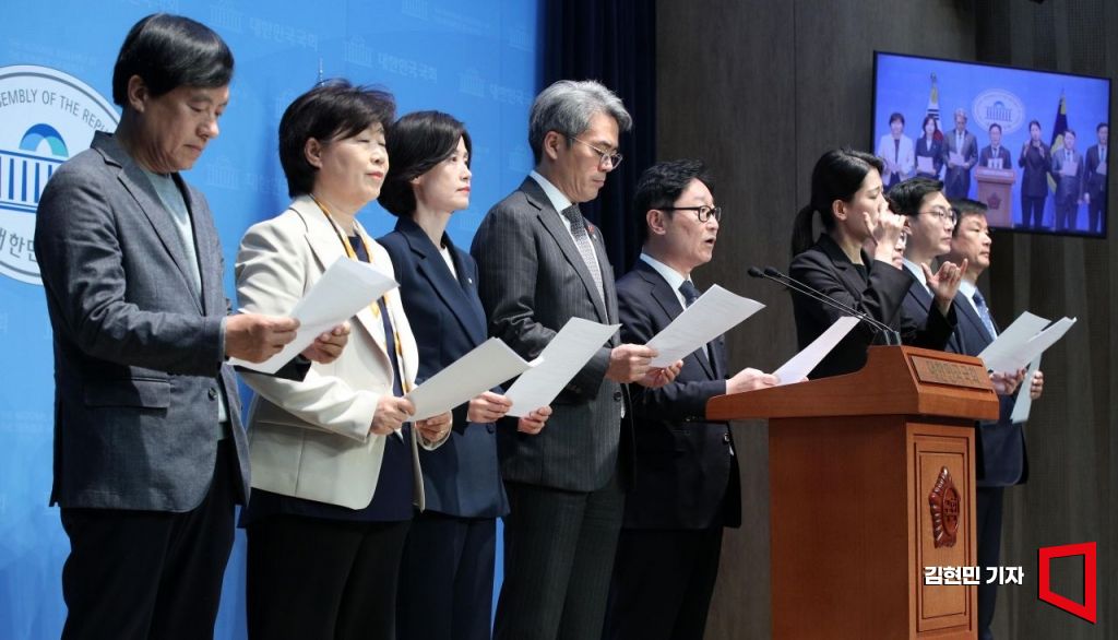 법제사법위원회 소속 야당 위원들이 8일 국회 소통관에서 기자회견을 열어 한덕수 대통령 권한대행의 헌법재판관 지명 철회를 촉구하고 있다.