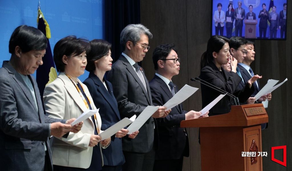 법제사법위원회 소속 야당 위원들이 8일 국회 소통관에서 기자회견을 열어 한덕수 대통령 권한대행의 헌법재판관 지명 철회를 촉구하고 있다.