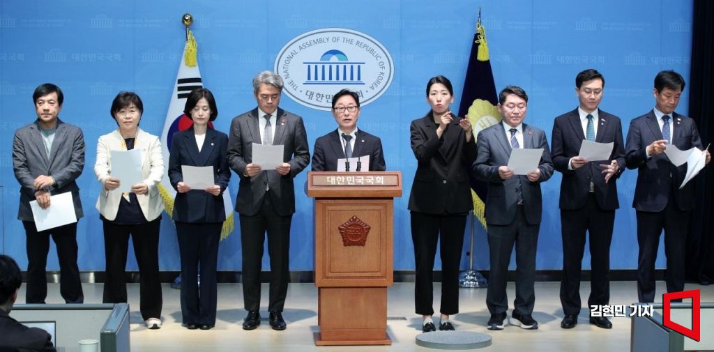 법제사법위원회 소속 야당 위원들이 8일 국회 소통관에서 기자회견을 열어 한덕수 대통령 권한대행의 헌법재판관 지명 철회를 촉구하고 있다.