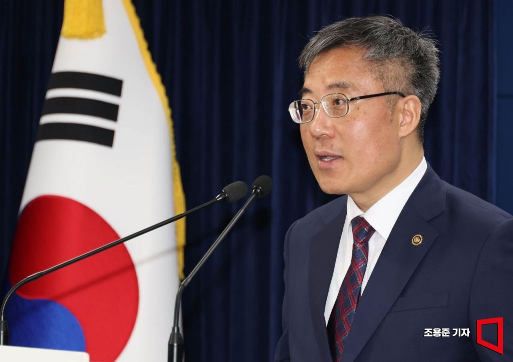 법무부 장관 권한대행인 김석우 법무부 차관이 14일 서울 종로구 정부서울청사에서 국무회의 결과에 따른 '명태균 특검법' 재의요구권 관련 브리핑을 하고 있다. 2025.3.14 조용준 기자