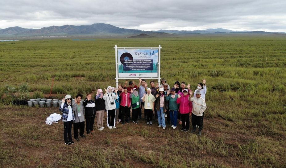2024년 8월 푸른아시아 조림사업장인 몽골 바양항가이에서 열린 ‘악뮤사랑의 숲’ 현판식 장면. 푸른아시아