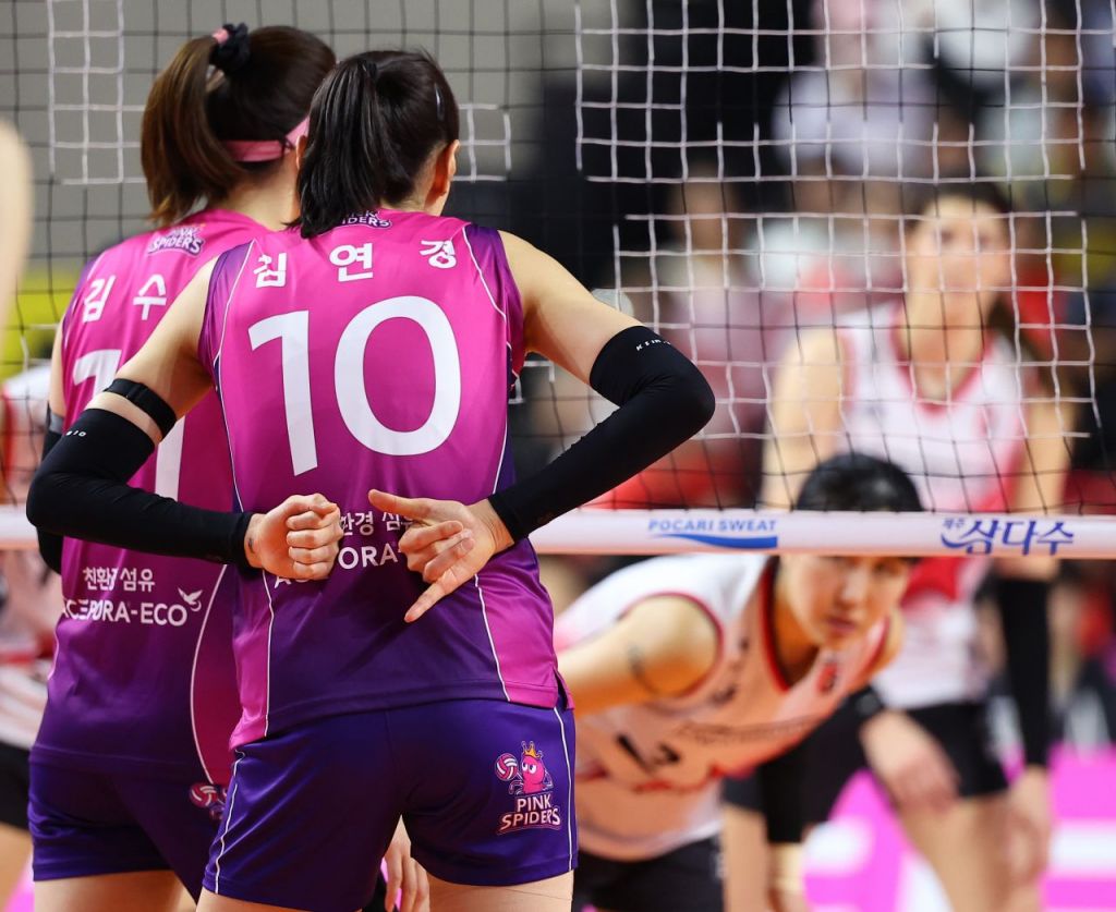 8일 인천 삼산월드체육관에서 열린 프로배구 V리그 여자부 챔피언결정전 흥국생명과 정관장의 5차전 경기. 흥국생명 김연경이 동료들에게 수신호로 사인을 보내고 있다. 연합뉴스