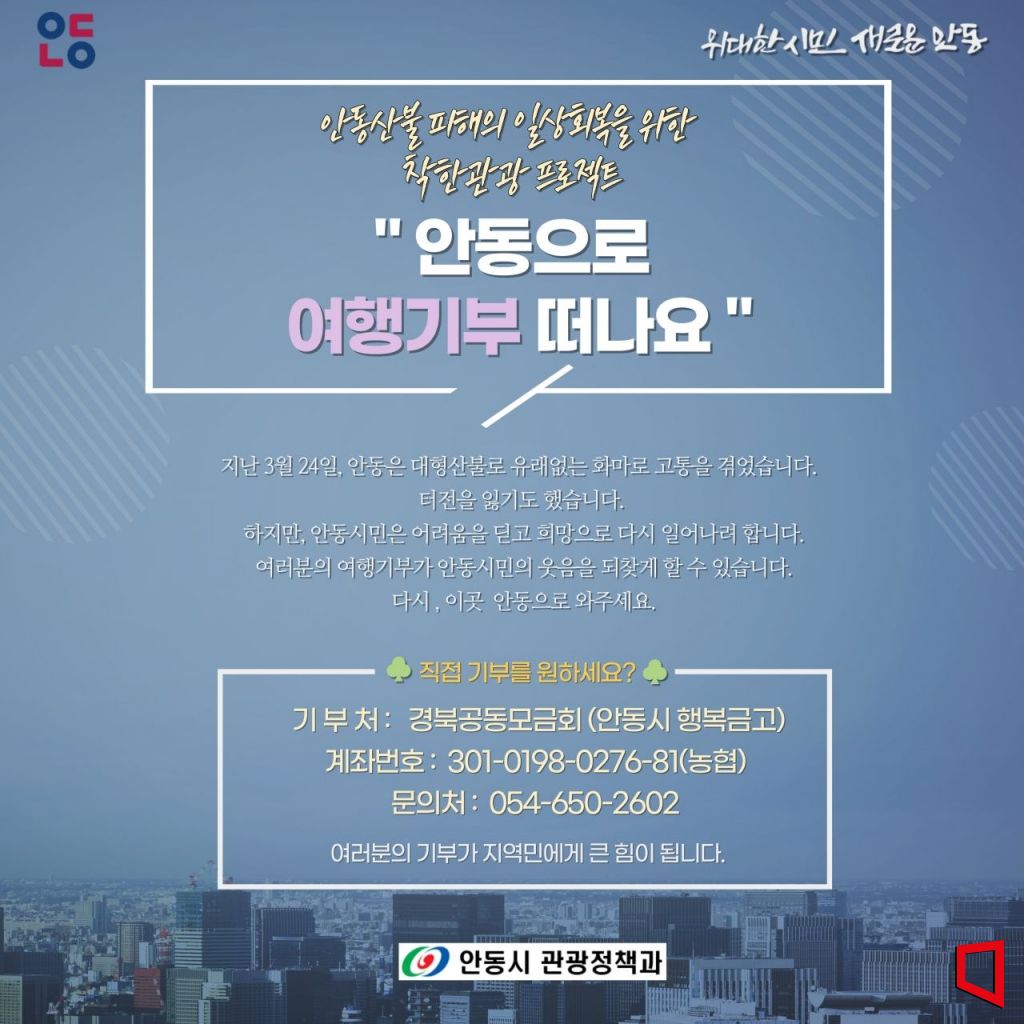 안동시 관계자는 "성금이나 자원봉사뿐 아니라 안동에서 관광을 즐기는 것 자체가 안동시를 돕는 길"이라며 "안동 여행은 단순한 관광을 넘어, 지역민에게는 위로와 격려가 될 것"이라고 말했다.