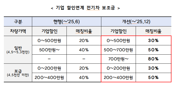 9일 정부가 발표한 '자동차 생태계 강화를 위한 긴급 대응대책'에 따르면 기업 할인 연계 전기차 보조금 제도가 올해 12월까지 연장되고, 보조금 매칭 비율이 상향 조정된다.