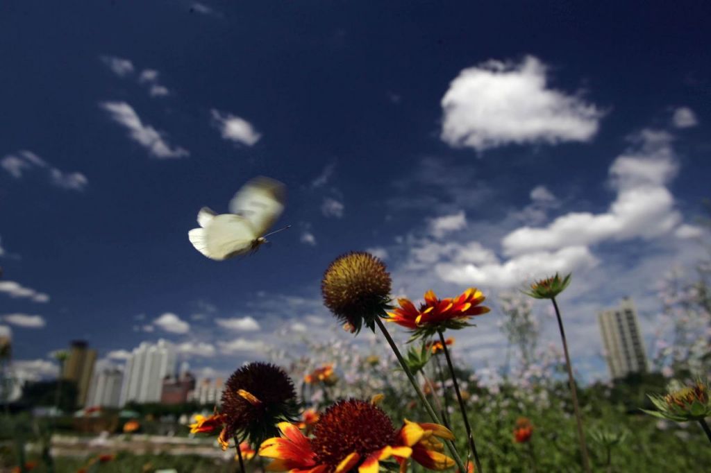 태풍이 지나간 다음날 한강변에 핀 천인국(天人菊) 위로 나비 한 마리가 맴돌고 있다. (2005년 서울) 허영한 기자