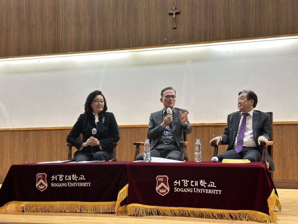 8일 서울 마포구 서강대에서 열린 특별강연 후 박영선 전 중소벤처기업부 장관과 문무일 전 검찰총장, 유재만 법무법인 광장 변호사가 질의응답을 하고 있다. 연합뉴스