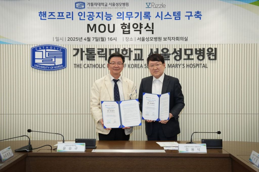 서울성모병원이 지난 7일 인공지능 헬스케어 스타트업 퍼즐에이아이와 인공지능 의무기록 시스템 구축 협약을 체결했다고 9일 밝혔다.